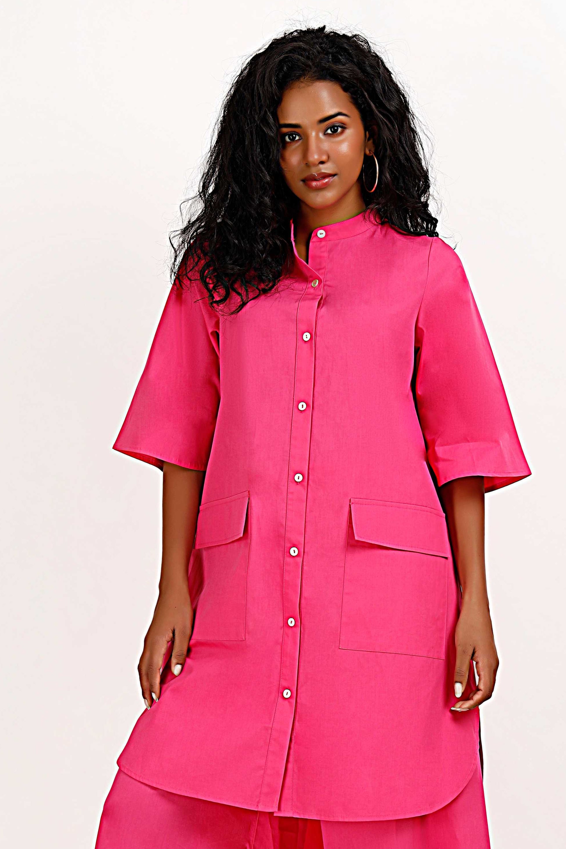 This top is designed in a relaxed straight fit, crafted from lightweight and breathable fabric for effortless comfort. It features a clean mandarin collar with a full front button placket for a modern, minimal look. The elbow-length sleeves add ease of movement, while the functional front patch pockets enhance everyday practicality. Finished with a curved hemline for a flattering fall, this versatile top is perfect for both casual and smart-casual styling.