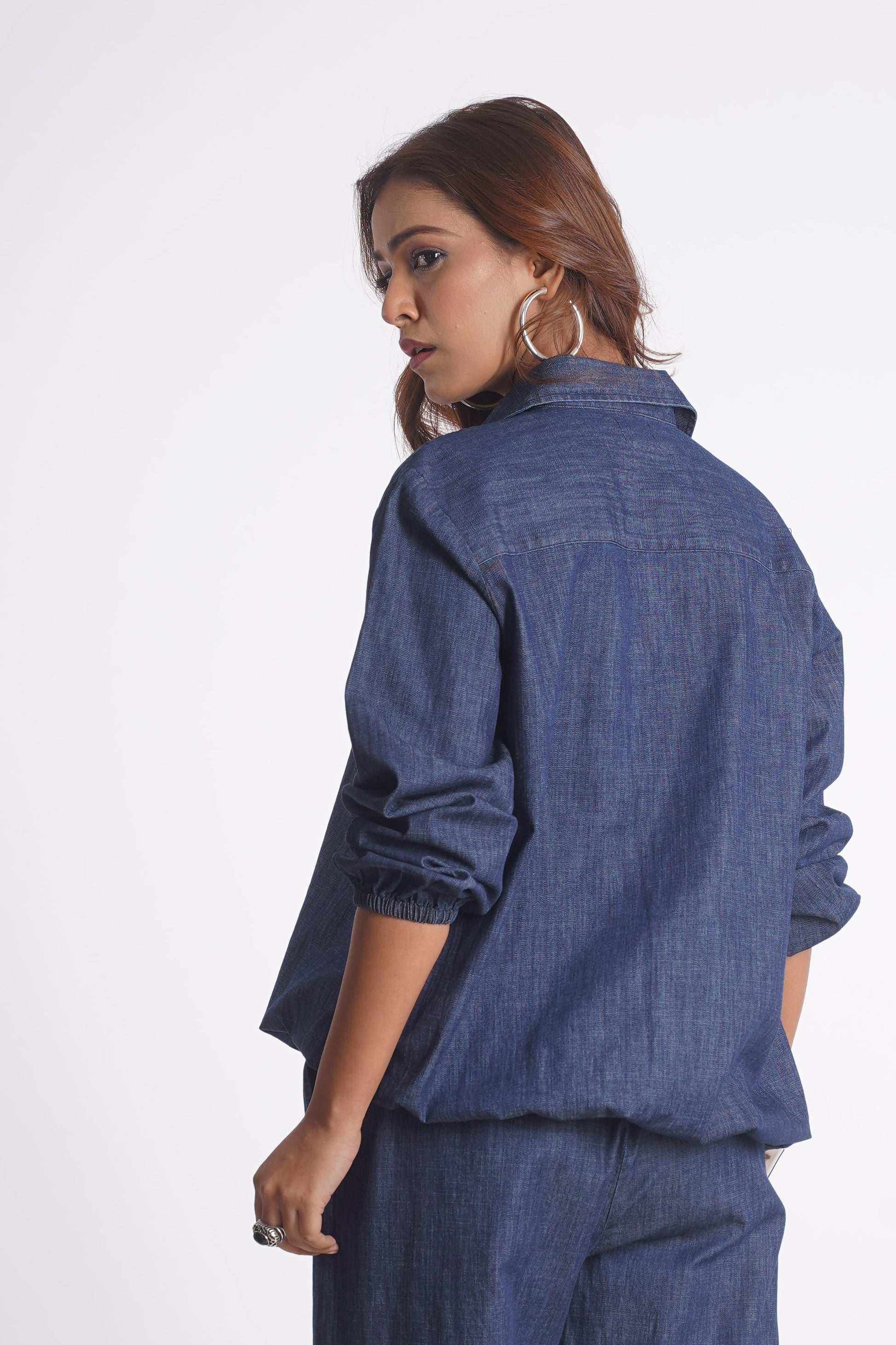 This denim top is designed in a relaxed, easy-fit silhouette crafted from durable yet breathable fabric for everyday comfort. It features a classic shirt collar with a full front button placket for a timeless look. The long sleeves come with elasticated cuffs, adding a casual touch, while the adjustable drawstring hem allows for a customizable fit. Perfect for effortless casual styling with a modern edge.