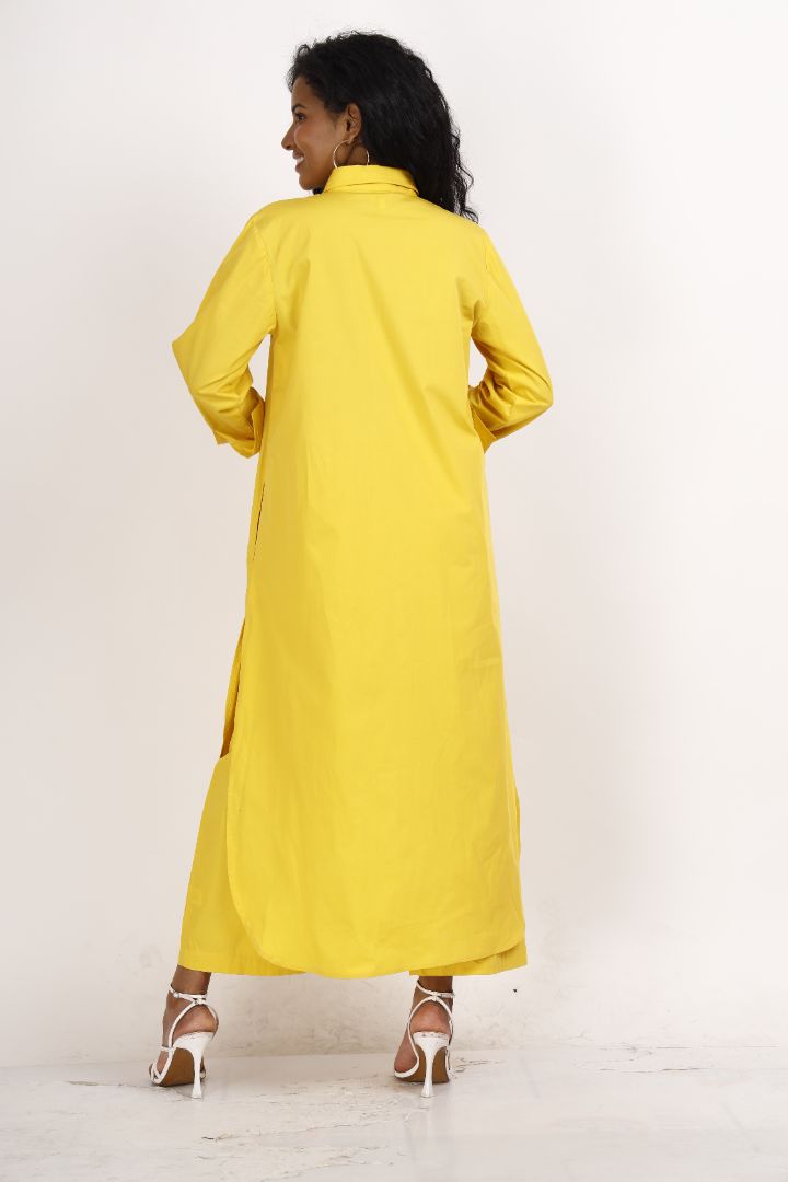 This stylish ensemble features a full-length dress in a yellow color, crafted in a shirt-style design with a collar and front button-down closure. It has short sleeves and two chest pockets with flaps, made from a denim-like fabric. The asymmetrical hemline is longer at the back and shorter at the front, creating a chic high-low effect. The dress is paired with matching yellow pants, adding a coordinated touch to the outfit. Completed with white open-toe high heels, this look is perfect for those seeking contemporary, versatile clothing that blends casual and chic elements.