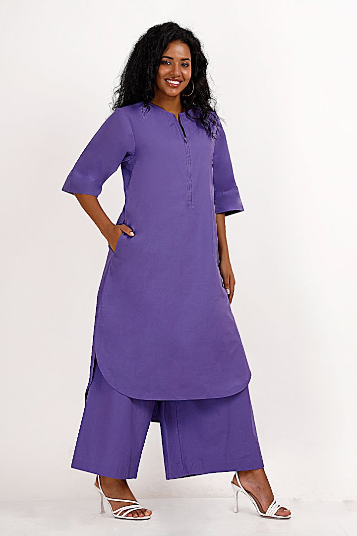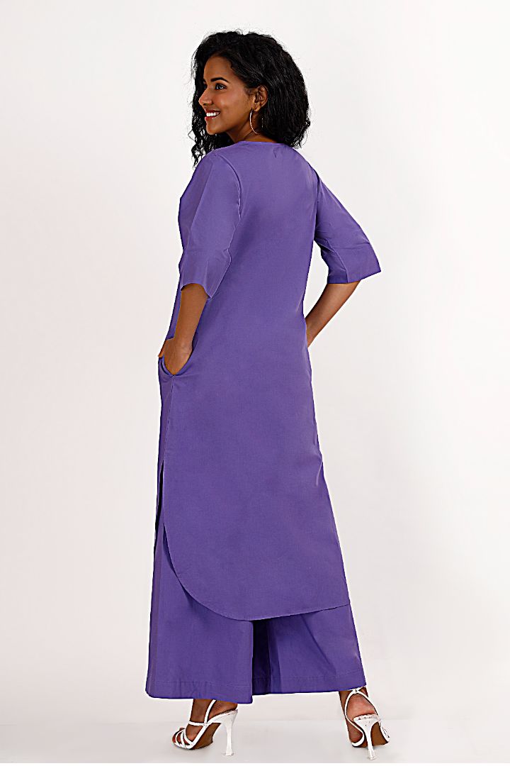This stylish ensemble features a knee-length tunic with a V-neckline and a charming tassel tie detail. The tunic has short sleeves that reach almost to the elbow and side slits at the hem for ease of movement. The rich, solid purple color adds a touch of elegance. Paired with matching straight-leg pants cropped just above the ankle, this outfit is both comfortable and chic. Completed with white open toe heeled sandals, this set is perfect for semi-formal occasions or stylish everyday wear.